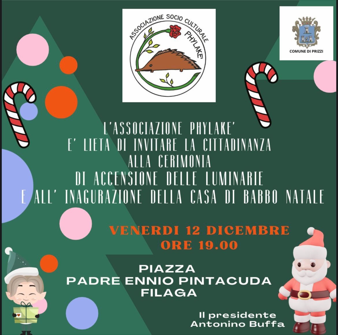 L’associazione Philakè è lieta di invitare la cittadinanza alla cerimonia di accensione delle luminarie e all’inaugurazione della casa di Babbo Natale, venerdì 12 Dicembre 2025 alle ore 19,00 in p.zza Padre Ennio Pintacuda a Filaga. Il Presidente dell’associazione Antonino Buffa