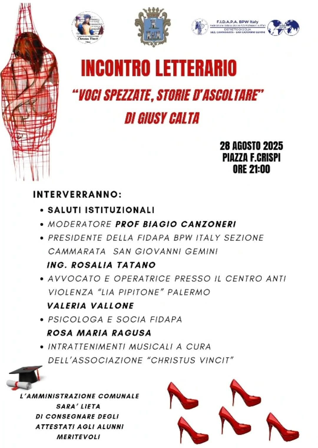L’incontro letterario Voci spezzate, storie d’ascoltare di Giusy Calta è un evento dedicato alla presentazione e discussione delle opere della scrittrice siciliana, che affronta con sensibilità e coraggio il tema della violenza contro le donne. Attraverso racconti, testimonianze o riflessioni che si intrecciano come frammenti di un’unica storia collettiva, i racconti dànno voce a chi per troppo tempo è rimasta in silenzio. Calta illumina le ferite invisibili, i percorsi di dolore ma anche di rinascita, mostrando quanto sia fondamentale ascoltare, sostenere e credere alle donne che vivono situazioni di abuso. Voci Spezzate non è soltanto una denuncia, ma anche un invito alla consapevolezza e al cambiamento: un appello a rompere il silenzio, riconoscere i segnali della violenza e costruire una cultura fondata sul rispetto e sulla dignità.