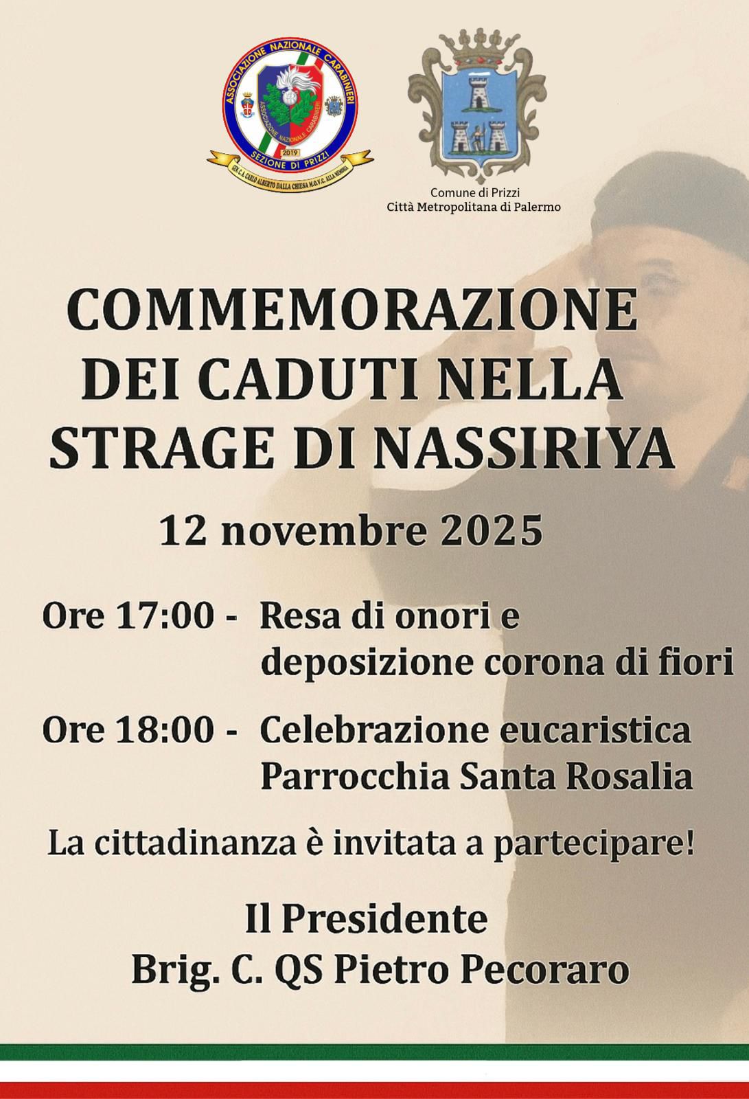 Commemorazione dei caduti nella Strage di Nassirya Mercoledì 12 Novembre 2025, ore 17.00 Resa onori e deposizione corona di fiori; ore 18.00 Celebrazione eucaristica Parrocchia Santa Rosalia;